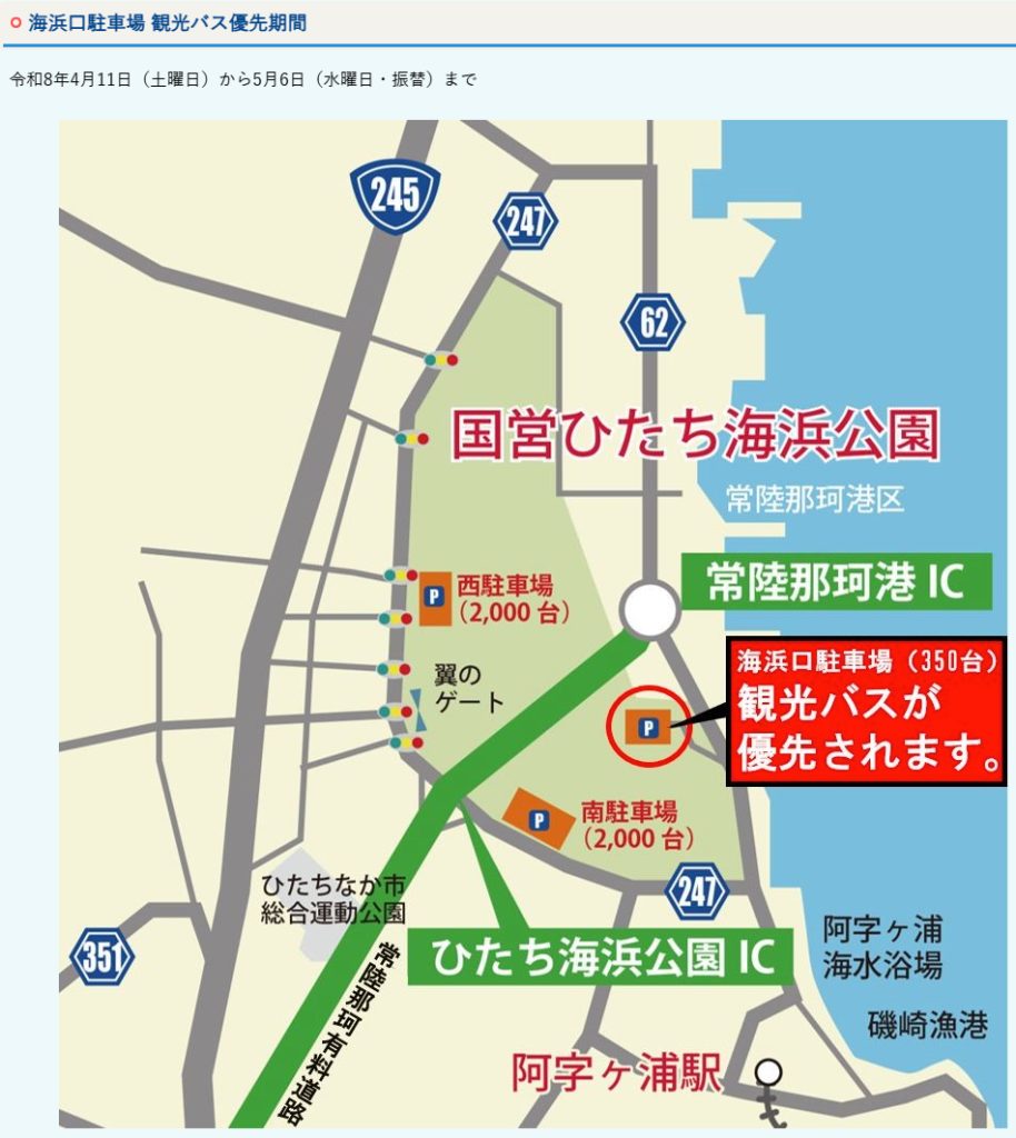 お車でご来園なさる方は、国営ひたち海浜公園の駐車場のページもご参考なさって下さい。 ※この期間中、『海浜口駐車場』は観光バス優先の駐車場になっています。